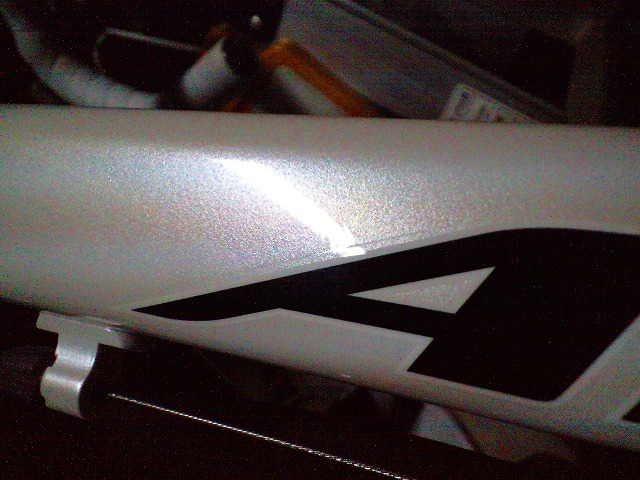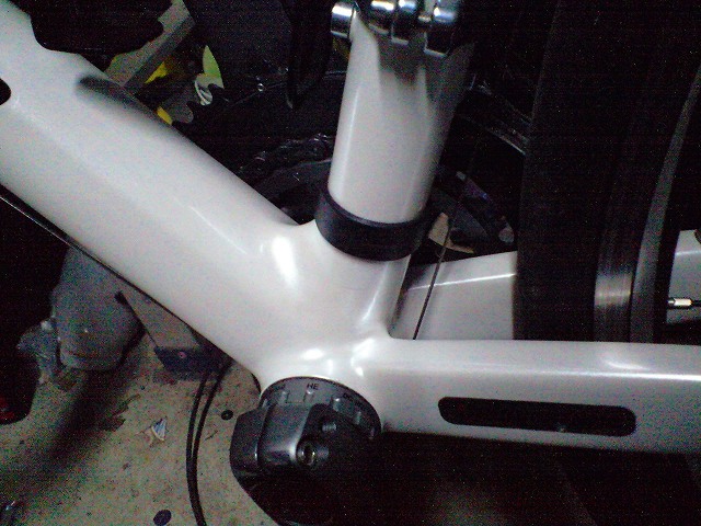 見た目は、パールホワイト塗装をチョイスしたため、およそカーボンフレームには見えない。